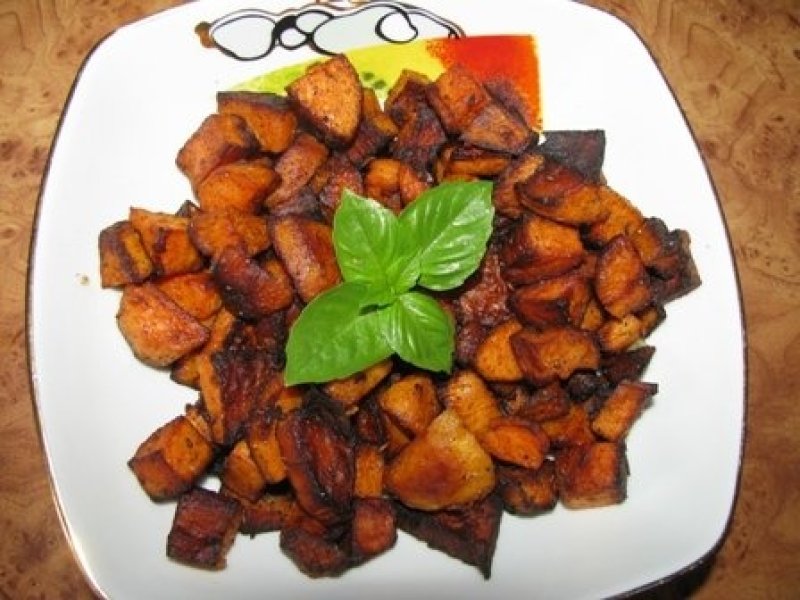 3. Se amesteca cartofii cu paprika, cuminul si scortisoara, apoi se prajesc pana se rumenesc si s-au facut.