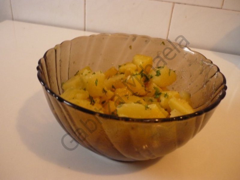 Se fierb cartofii in cu tot cu coaja. Dupa fierbere se decojesc si se taie cuburi. Se aseaza pe o farfurie mai adanca si se adauga untul, cat sunt cartofii calzi ca untul sa se poata topii. Se adauga sare si patrunjel.