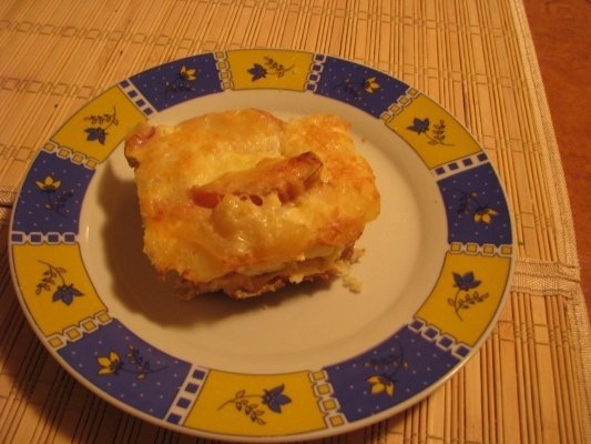 Se fierb cartofii în coajă, securăţă şi se taie felii. Se aşază într-un vas termorezistent uns bine cu unt, un rând de cartofi, peste ei se adaugă un rând de brânză rasă pe răzătoarea mare şi câteva bucăţi de unt, se alternează straturile de cartofi şi brântă până terminăm cartofii şi brânza. Ultiml strat este de cartofi. Peste ei se toarnă ouăle bătute bine în care am adăugat şi smântâna. Cine mănâncă mai sărat poate pune şi un praf de sare în ele. Eu nu pun. Deasupra de rade caşcaval, se pun şi ultimele bucţi de unt şi se bagă la cuptor. Se lasă la cuptor până se rumenesc frumos şi deasupra.