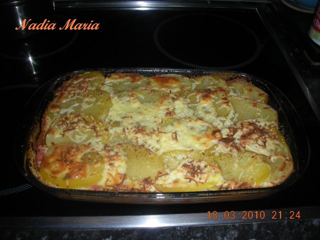 Se unge o tava cu unt si se presara pesmat. Se taie cartofii in rondele si se aseaza unul langa altul pe fundul tavii , se pun ouale taiate, sunca taiata si jumatate din cascaval, se sareaza si pipareaza, apoi se pune alt strat de rondele de cartofi si a doua jumatate din cantitatea de cascaval razuit. Se sareaza si pipareaza din nou.