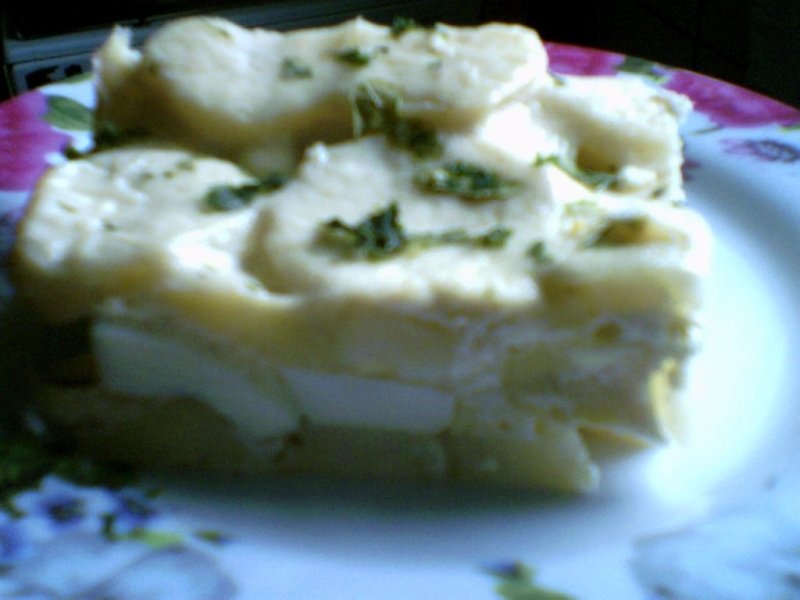 Intr-o tava unsa bine cu unt se aseaza alternativ felii de cartof cu felii de ou fiert.