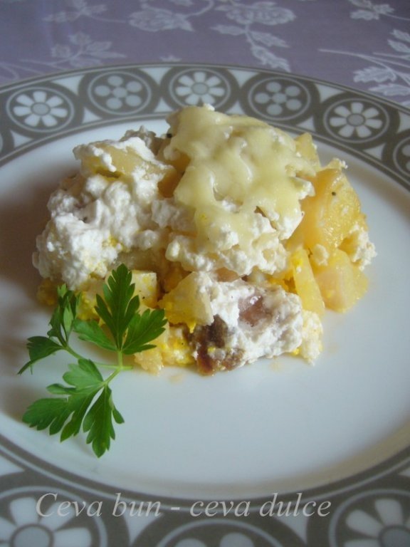 Se unge un vas termorezistent cu ulei, se aseaza jumatate din cantitatea de cartofi, ouale taiate, se condimenteaza cu sare si piper, adaugam carnatul taiat rondele, jumatate din cantitatea de smantana si jumatate din cantitatea de cascaval.