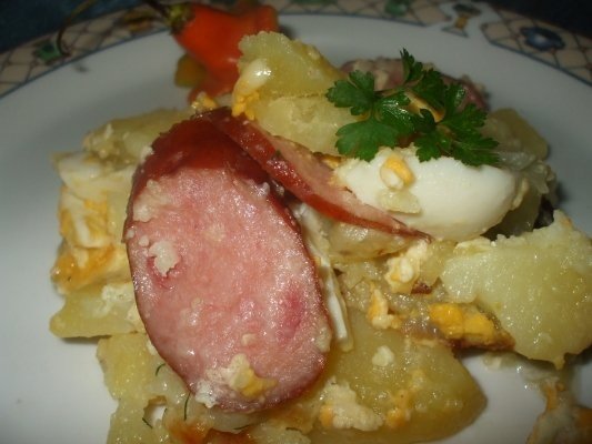 Ungeti un vas yenna cu ulei, puneti doua randuri de felii de cartofi, pe margine feliile de sunculita, apoi acoperiti cartofii cu un strat de felii de carnat. Continuati cu un strat de oua fierte tari taiate bucati, acoperiti cu restul de felii de cartofi si cu feliile de cascaval.