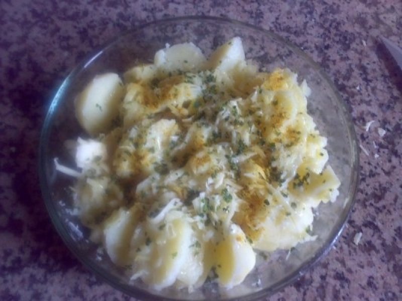 Cartofii se taie cubulete,felii etc,calzi,se amesteca cu untul taiat feliute,se orneaza cu patrunjel,sareaza,deasupra se rade cascaval,sau branza,se presara curry,se introduce la cuptorul microunde,gril timp de 8 minute la putere medie,pana se coloreaza;