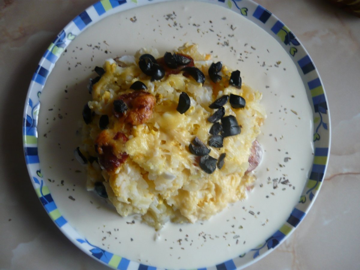 Fierbem cartofii in coaja si 9 oua separat.Dupa ce s-au fiert si racit le curatam bine de coaja.Intr-o tigaie punem pe fund un pic de ulei si razalim prin ochiul mare un strat de cartofi sa acopere bine tot.Urmatorul strat este din 3 oua tot razalite prin ochiul mare.Dupa ce s-a acoperit bine cu ou punem un pic de sare peste stratul format.Adaugam cartatul taiat feliute subtiri si deasupra razuim cascaval si s-a format primul strat,dupa care incepem din nou un strat de cartofi,oua,sare,carnati si cascaval cam 3 straturi.La final intr-un castron spargem oul ramas si il batem bine cu 3 linguri de smantana,sare si piper. Taiem bucatele mici mazlinele si le punem peste straturile de cartofi cu ou si la final punem compozitia de smantana deasupra si bagam la cuptor pana se face o crusta frumos rumenita.Se poate servii cu smantana,muraturi,salata.Merita incercat!!