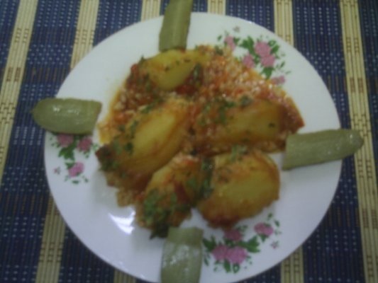 Cartofii dupa ce au fiert se lasa la racit, apoi se taie in jumatate sau in sferturi in functie de marime. Se aseaza intr-o tava, se toarna sosul si orezul fiert. Se introduce la cuptor pentru a se rumeni putin. Cand sunt gata presarati patrunjel verde tocat fin.
