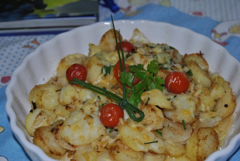 4)într-o formã pt cuptor se pune jumãtate din cantitatea de cartofi, peste se pun ceapa si usturoiul pãstrat, verdeatã tocatã si se acoperã cu restul de cartofi .Eu am pus brânzã rasã si câteva rosii cherry.
