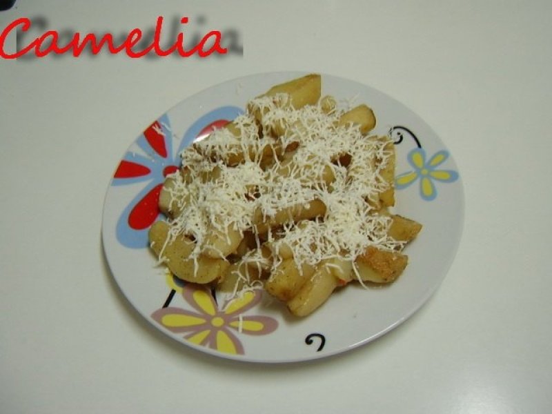 Se spala cartofii de pamant, se curata, se taie bucati mai mari si se pun intr-un vas de yena cu capac, se presara cu sare si piper, se pun cele 2 lingurite de Secretul gustului si uleiul si se introduce vasul acoperit in cuptorul incins. Cand sunt aproape gata se ia capacul ca sa se rumeneasca cartofii. Se scot din cuptor, se presara cu usturoi granulat si cu o paleta se pun in farfurii si se rade branza peste ei.