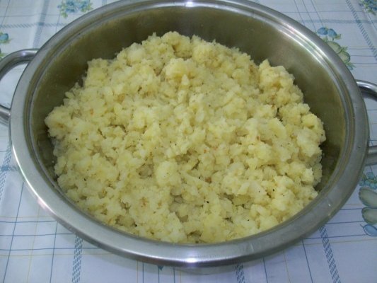 Cartofii, spalati f bine,se fierb(cu o lingurita de sare),sa fie f moi.Fierbinti se curata si cu o furculita se maruntesc;nu trebuie sa fie facuti f marunti;de-aia folosim furculita.