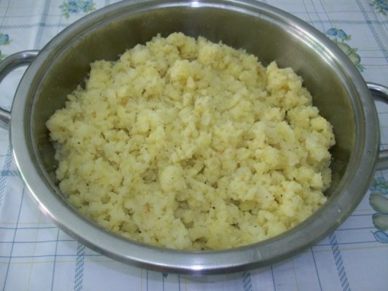 Ceapa,taiata marunt,se prajeste in uleiul de masline;se pune apoi peste ea,cartofii maruntiti.Se potriveste de sare si piper.Se mesteca f bine;se ia de pe foc.