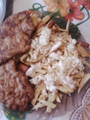 Feliezi pieptul de pui si il bati. Treci feliile de carne prin faina, ou si prajesti pe ambele parti. Cartofii spalati, uscati in prosop, se prajesc in ulei incins.