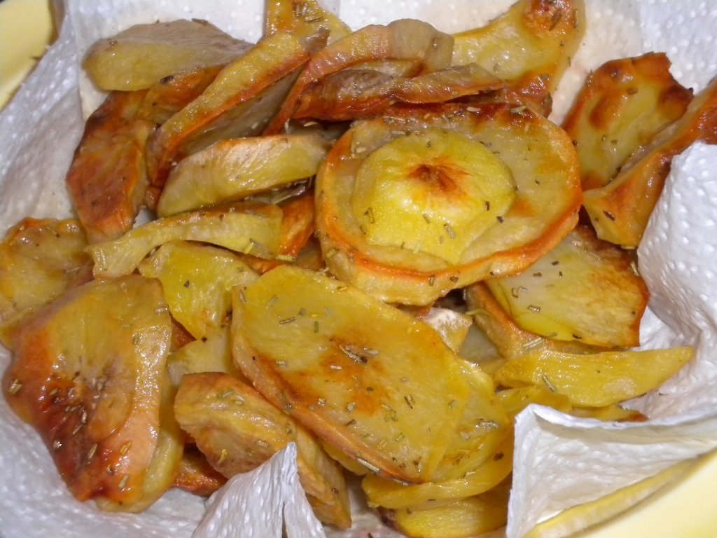 Se pune o foaie de copt in tava de la cuptor si se aseaza rondelele de cartfi. Asezonati cu sare si piper dupa gust. Stropiti cu ulei si adaugati rozmarinul.
