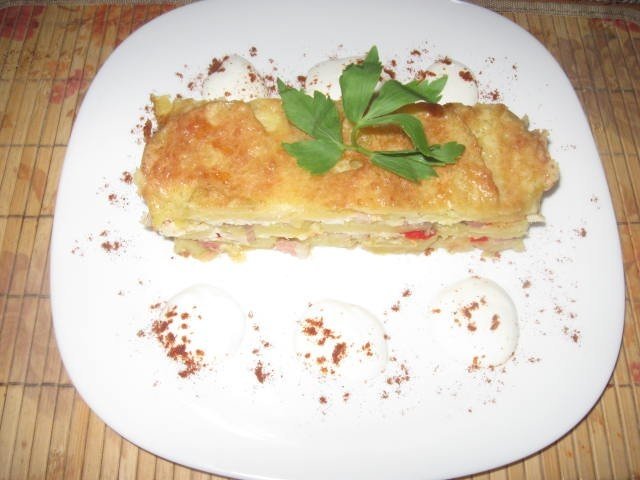 Se tapeteaza un vas termorezistent cu unt si pesmet. Se aseaza un strat de cartofi, costita, ceapa, ardei, branza,cascaval , se unge cu ou batut si se reia procedeul , ultimul strat fiind de cartofi. Se adauga cubulete de unt si se introduce vasul in cuptorul preincalzit in prealabil pentru cca 15-20 , suficient pentru inmuierea stratului de cartofi, dupa care se scoate din cuptor, se presara cascaval ras , oul batut ramas si se reintroduce la cuptor pana se obtine un preparat final frumos gratinat...