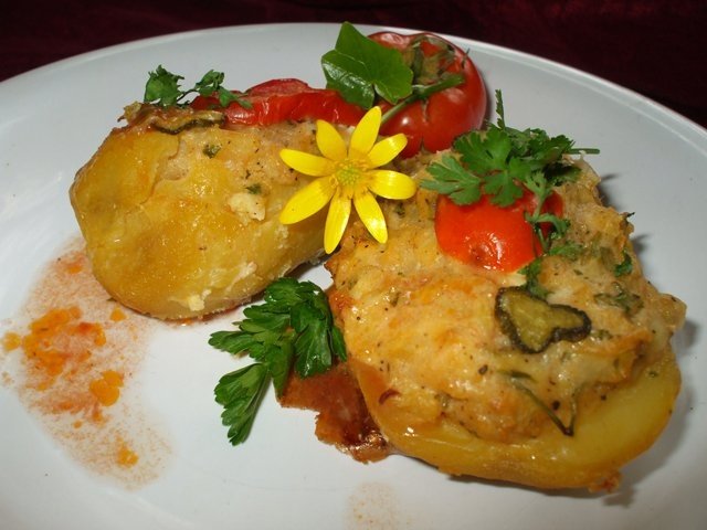 Umpleti generos jumatatile de cartofi cu compozitie, decorati cu cate o feliuta de rosii (castravete acru, gogosar) si cu frunze de patrunjel. Puneti cartofii intr-o tava cu putina margarina sub fiecare si dati la cuptorul preincalzit, la foc mediu, aproximativ 30 minute.