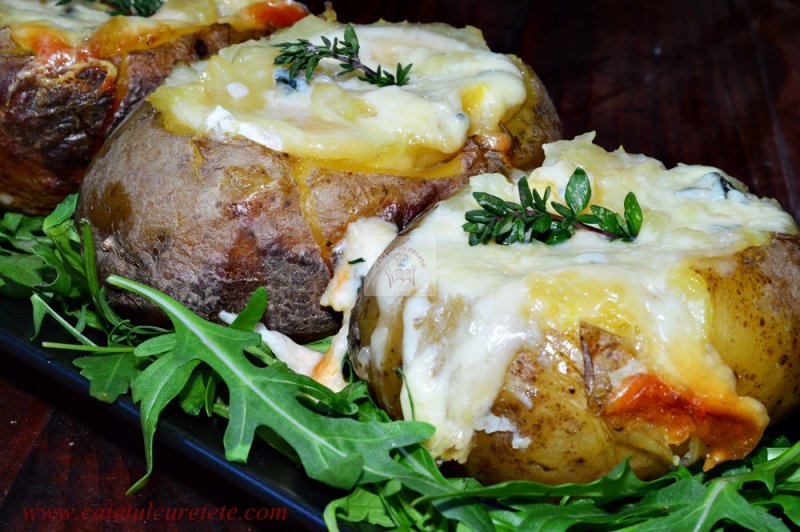 Pasam miezul scos de la cartofi si il amestecam cu branza cu mucegai rupta bucatele, cascavalul dat pe razatoare si parmmezanul ras sau aschii de parmezan (cu ajutorul curattatorului de legume) Asezonam cu sare si piper si umplem cartofii cu aceasta compozitie.