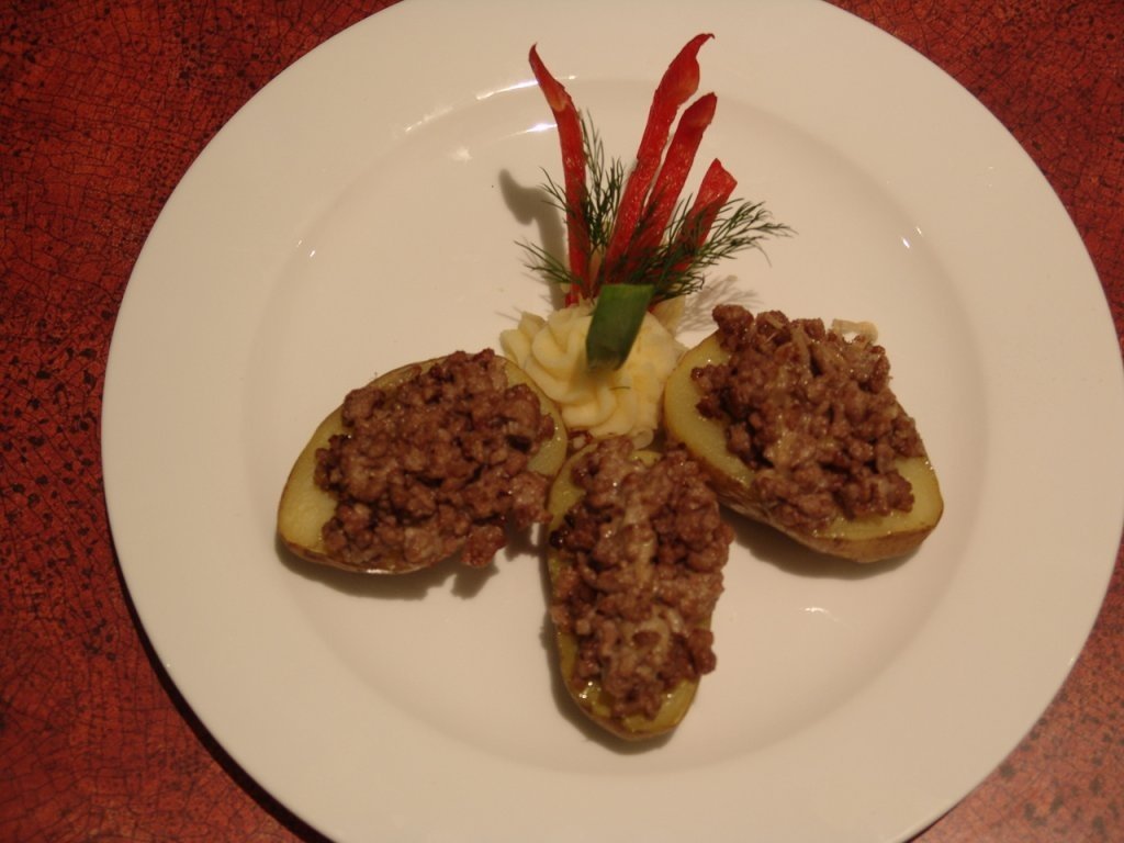 Umpleti cartofi cu acest sos de carne tocata si introducetile in cuptorul pre incalzit la 180 de grade timp de 15-20 min. Serviti-le fierbinti.