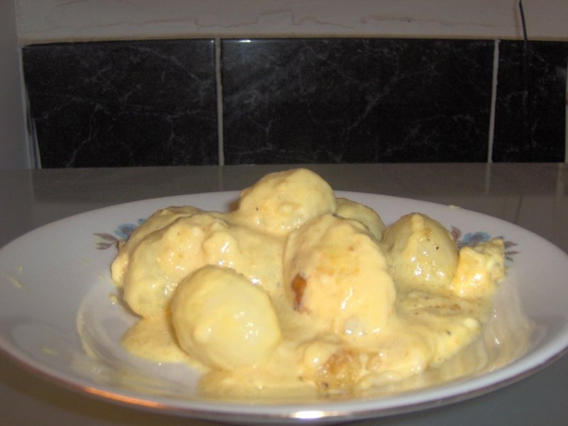 Intr-un vas din pyrex sau un vas rezistent la cuptor se unge cu putin unt si se pun cartofii curatati de coaja se toarna sosul de smantina si deasupra se presara cu branza.