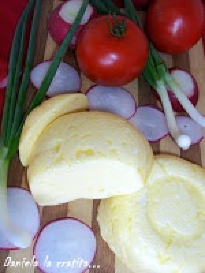 Separat intr-un vas de tuci,punem untul la topit si adaugam branza maruntita.Intr-un castronel ,batem oul cu sare si bicarbonat si apoi il turnam peste branza.Din acest moment,amestecam in continuu avand grija sa nu se lipeasca si cand compozitia devine crema,atunci dam vasul deoparte.