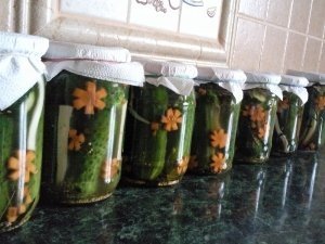 Castravetii se spala foarte bine , li se taie capetele apoi se asaza vertical in borcane . Hreanul se curata , se taie fasii si se aseaza printre castraveti . Morcovii se curata , se taie rondele apoi se cresteaza frumos pe margini cu varful unui cutit aranjand apoi feliile printre castraveti . Deasupra se pun cateva frunze de visin apoi betele de marar care vor presa toata compozitia , mentinand-o ferma .