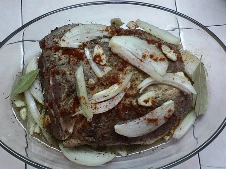 Din condimente si vin obtin un baitz in care marinez carnea timp de 2 ore.Asez carnea intr-un vas de yena, adaug ceapa, usturoiul,foi de dafin,baitzul ramas, apa, presar chilli,dau la cuptor. Periodic stropesc friptura cu sosul din vas, sau o intorc sa se patrunda uniform. O feliez dupa ce se raceste.