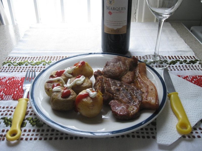 Spalam bine cartofii si punem la fiert in apa cat sa le acopere cu sare cca. 20-25min. Ungem cu unt o forma de sticla sau tava si rasturnam cartofii fierti si scursi de apa dupa care le sfaramam putin cu ciocanul de snitele, punem bucatele mici de unt deasupra si introducem la cuptor pana se rumenesc(10-15min). Eu am pus sub grilul cuptorului. Scoatem carnea din frigider si facem un gratar la grilul cuptorului si frigem 7-9min. pe fiecare parte. Punem in farfurie o felie de ceafa impreuna cu cativa cartofi din tava alaturi de ketchup si maioneza. Se serveste cu salata si un(doua) pahare de vin rosu demisec. Va urez pofta buna!