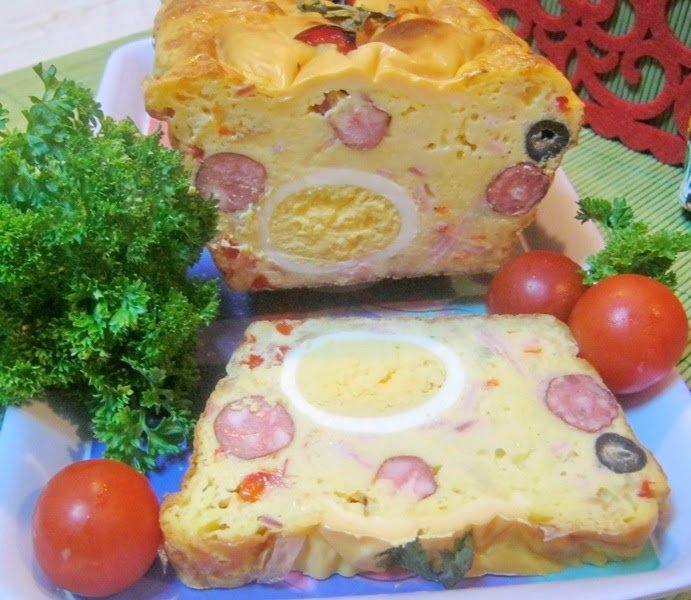 O tava de chec o tapetam cu hartie de copt unsa cu putin unt si punem in ea 1/2 din compozitie. Pe marginile tavii punem doi carnati si intre ei ouale fierte :
