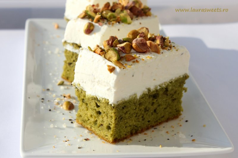 Stevia se spala, se paseaza fin la blender, impreuna cu fisticul si uleiul de masline. Se adauga un praf de sare. Se incorporeaza totul in compozitia de unt cu oua si se omogenizeaza. Se adauga faina cernuta cu praful de copt. Se amesteca usor pana se omogenizeaza. Se toarna compozitia in forma de copt, se bate usor de blat, se pune la copt, in cuptorul preincalzit, la 180 de grade, timp de aproximativ 30-35 minute.