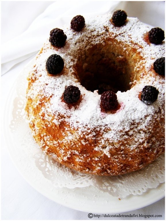 Se incorporeaza spuma cu o spatula in restul aluatului. Se toarna totul in forma si se da la cuptorul preincalzit, la 160 de grade pe randul cel mai de jos, timp de 1h-1h15 sau pana cand trece testul scobitorii. Se lasa in forma, cum am scris mai sus, sa se raceasca complet. Se poate servi pudrat cu zahar. Este un chec cu o textura umeda si aroma puternica de banane. Pofta buna!
