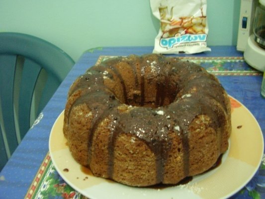 ....Am pus intr-o forma rotunda ,unsa cu ulei si presarata cu putina faina.Se da la cuptor si testati cu scobitoarea cand e gata.