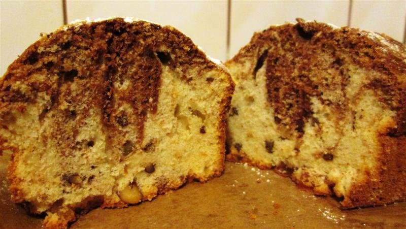 Adaugam si nuca si rahatul taiate marunt. O treime din compozitie o amestecam cu cacao. Turnam compozitia in tavile in care am pus hartie de copt, apoi adaugam si compozitia cu cacao si amestecam usor cu un cutit sau caoada unei linguri. Introducem in cuptorul incins. Coacem aproximativ 50-55 minute. Facem testul cu scobitoarea pentru a verifica daca este copt.