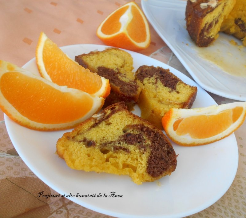 Ouale impreuna cu zaharul le batem spuma pana cand isi schimba culoarea si nu se mai simt granulele de zahar.Adaugam coaja razuita de portocala , 1 lingurita apa de trandafir , faina amestecata in prealabil cu praful de copt si cu bicarbonatul , sucul de portocale si uleiul. Omogenizam rapid si turnam ¾ din compozitie in forma de guguluf