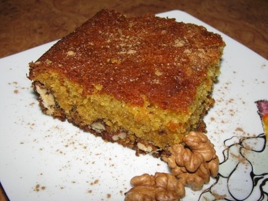 4. Intr-o tava mai mica, se pune jumatate din cantitatea de aluat.Se presara deasupra jumatate din cantitatea de umplutura, apoi se repetea operatiunea inca o data.Se da totul la cuptor 50-60 minute, pana cand la inserarea unei scobitori in centru aceasta va iesi curata.Prajitura se serveste calda sau la temperatura cuptorului.