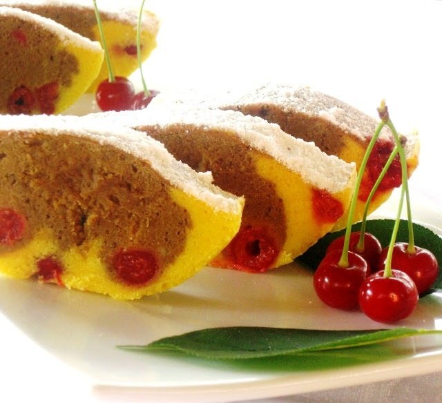 Ungem o tava de chec cu putin ulei sau unt ,o captusim pe interior cu hartie de copt , adaugam compozitia alba, apoi compozitia cu cacao iar deasupra visinele .
