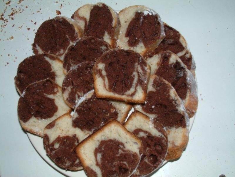 Se tapeteaza doua forme de chec(unse cu ulei si apoi presarat pesmet, eu il prefer fainii), se pune jumatate din compozitie in mod egal in cele doua tavi. Se adauga cacao in compozitia ramasa si se toarna in tavi.Cu o furculita amestecam usor compozitia pentru a marmora checul. Se introduce in cuptorul incins, si nu se deschide cuptorul in primul sfert de ora. Checul este copt cand paiul cu care incercam iese curat(aproximativ 40 min., in functie de cuptor)