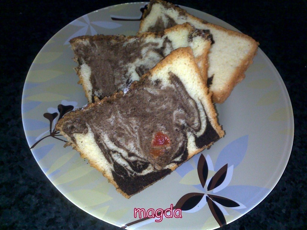 Cand suntem gata cu spuma oparita, mutam paletele mixer-ului sau telul in vasul in care avem galbenusurile cu praful de sare, cele 12 linguri de ulei, esentele si praful de copt stins in otet sau lamaie, le mimixam bine si turnam usor peste spuma. Amestecam in continuare si punem si faina in ploaie. Turnam 3/4 din compozitie in tavile pregatite, iar in 1/4 ce ne-a ramas adaugam cacao. Punem amestecul de cacao peste compozitia alba si amestecam usor cu caoda unei linguri pentru a marmora checurile. Eu am mai adaugat nuca si rahat (pe care l-am maruntit bine si l-am dat prin faina pentru a nu se lasa). Dam la cuptorul preincalzit, pentru aproximativ 50 minute la 180 grade. Daca trece testul cu scobitoarea, e gata! Este o pufosenie!