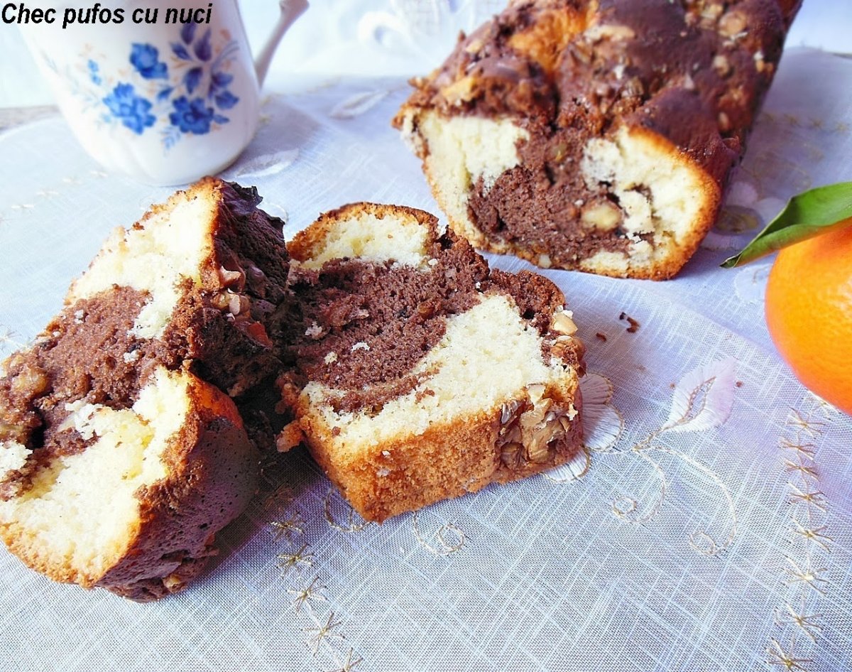 Turnam compozitia de cacao peste cea alba, iar deasupra punem miezul de nuca taiat bucati si coaja de portocala confiata.