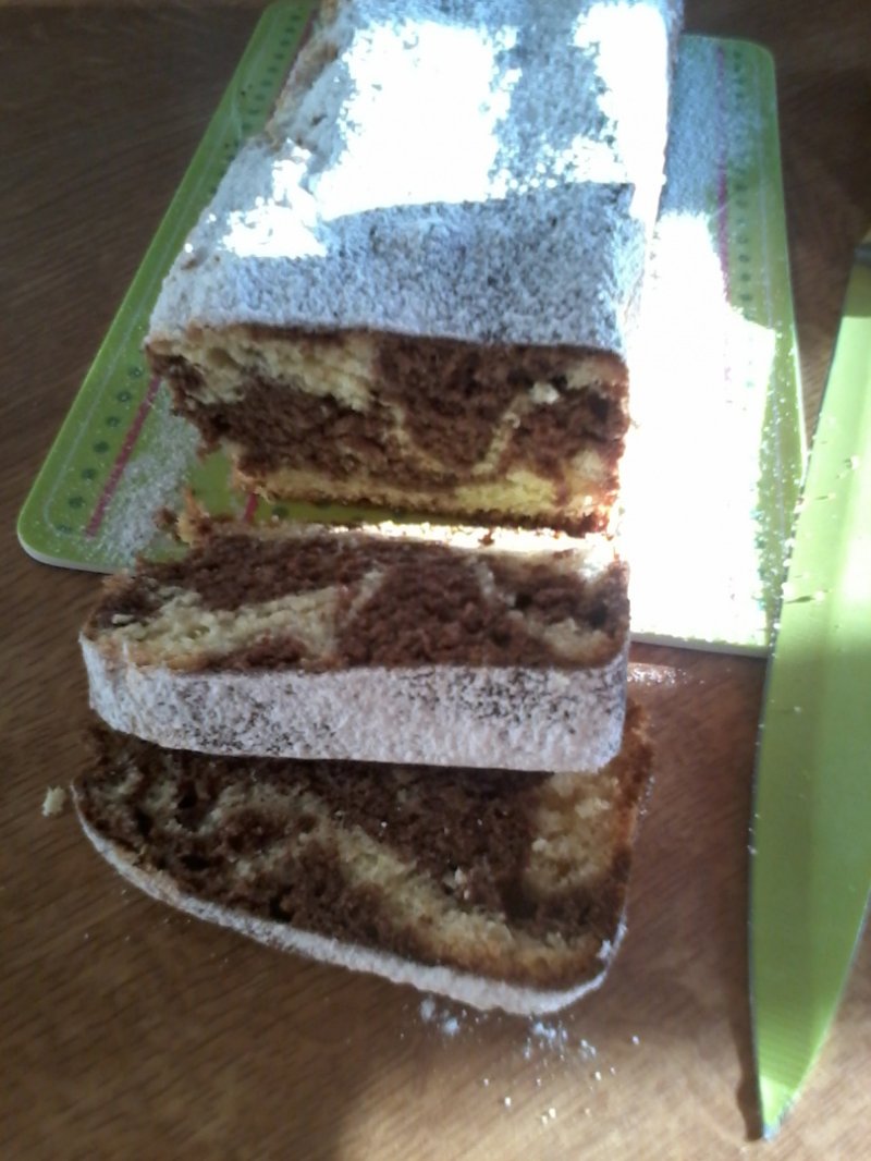 Intr-o tava tapetata cu hartie se pune prima data jumatate din comp. alba, jumatate din comp. cu cacao, iar cu o furculita incercati sa amestecati usor cele doua spume. De-asupra punem comp. alba care a mai ramas si cea de cioco.