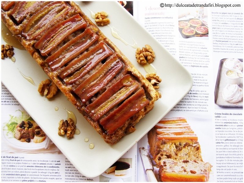 Torni aluatul in tava si-l intinzi uniform, cu grija sa nu deranjezi stratul de banane. Pui in cuptorul preincalzit la 170 de grade pentru 45 de min. Dupa primele 20 de min, ii scazi temperatura pana la 150 de grade. Asa am procedat eu, insa in revista este recomandat acelasi timp de coacere insa la 140 de grade. In orice caz, faci mai intai testul scobitorii.