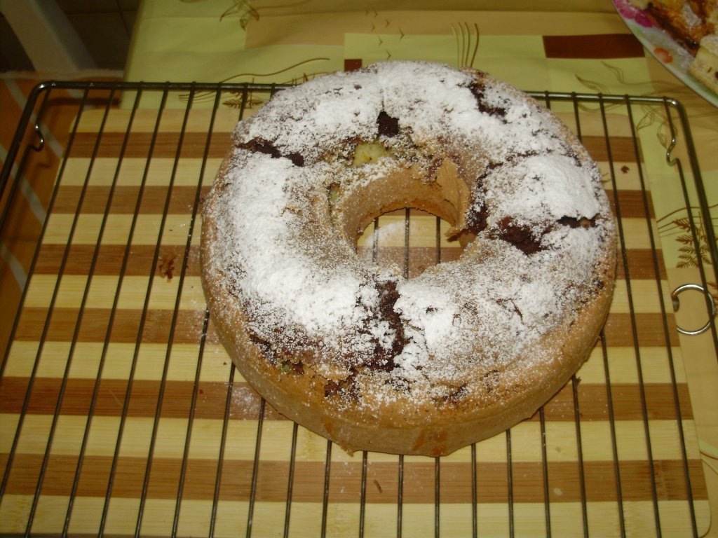 Batem ouale intregi cu zahar, bine-bine, adaugam si zaharul vanilat si coaja rasa,putina sare. Treptat adaugam faina. Pregatim o forma rotunda de chec si o tapetam cu ulei si faina.turnam in forma mai bine de jumatate din compozitie, restul pastram si amestecam cu cacao, dupa care o turnam in forma peste compozitia de dinainte. Cu o furculita,"amestecam" prin compozitie, pentru a se amesteca culorile.se da la cuptor la o temperatura de 165 grade, pentru cca 30 minute.