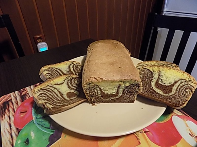 Se separă cele 5 ouă. Albușurile cu puțină sare se bat spumă , se adaugă zahărul vanilat, cele 200 grame de zahăr și se mixează până se topește tot zahărul. Gălbenușurile se freacă cu cele 4 linguri de ulei cu ajutorul unei linguri din lemn. Se încorporează în compoziția de albușuri, gălbenușurile și făina amestecată cu praful de copt, încet pentru a păstra aerul . Se separă compoziția în două părți egale și apoi într-una se adaugă 2 linguri de cacao. Se preîncălzește cuptorul.Într-o tavă de chec, în care se pune hârtie de copt, se adaugă câte o lingură din fiecare compoziție , până se vor termina. Se coace în cuptor la 150 grade , timp de cca 40 minute.