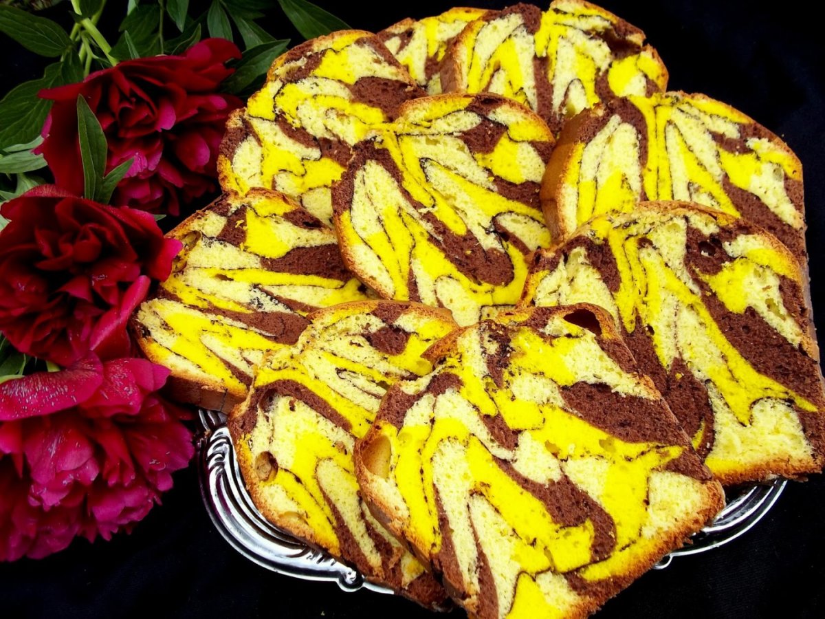 Compozitia obtinuta o impartim egal in 3 vase: compozitie, compozitie in care punem 2-3 picaturi de colorant galben, compozitie amestecata cu 1 lingura cacao. Turnam compozitia in 3 pungi care le taiem la varf, dupa care in tava de copt tapetata cu faina vom turna compozitia alternand culorile. Dupa fiecare rand vom presara cacao, apoi repetam operatia pana terminam compozitia din pungi.