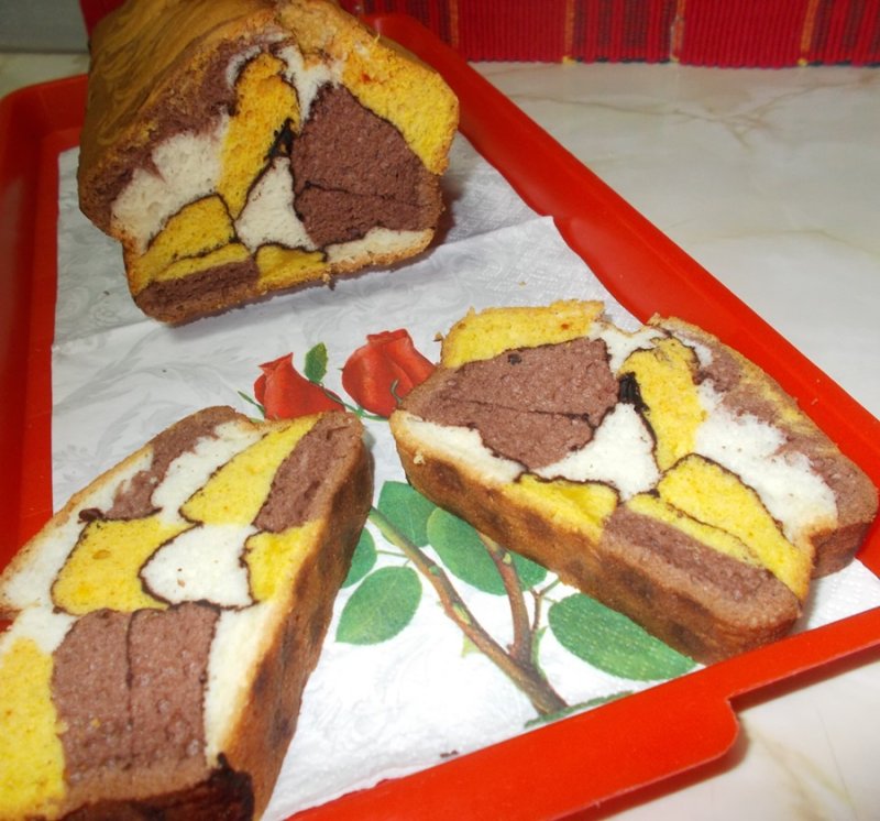 Punem al doilea rand de aluat, astfel incat sa nu se suprapuna culorile : galben, alb, maro, pudram cu cacao neagra si al treilea strat : alb, maro, galben.
