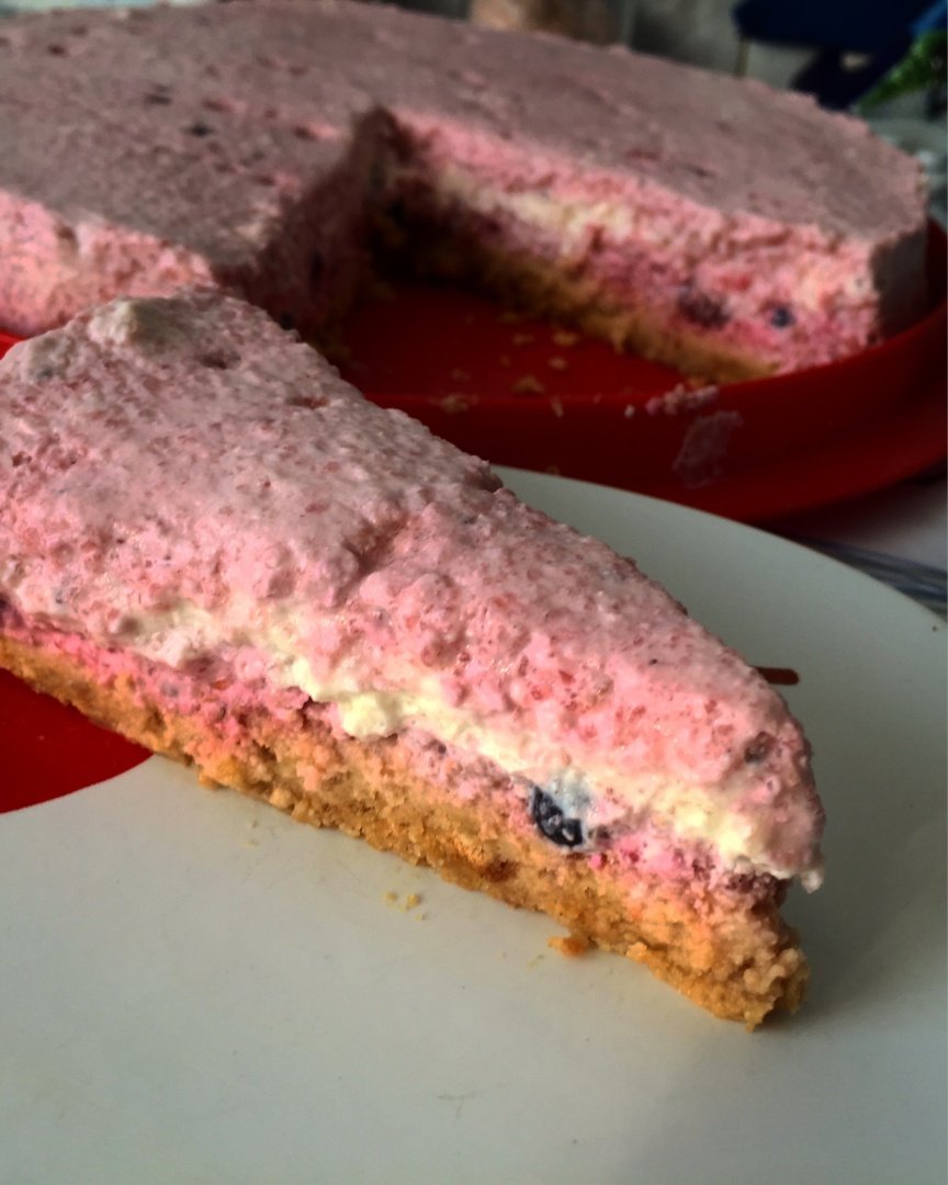 Gelatina se hidratează conform instrucțiunilor, fructele se pun la foc mic cu 2 linguri de zahăr și 2 linguri zeama de lămâie, timp de 10-15 minute și se amesteca din când in când, după care se pun la scurs și se lasă sa se răcească. Se amesteca brânza cu zaharul (preferabil ar fii sa îl faceți pudra), iaurtul, smântâna și 2 linguri de zeama de lămâie, peste care se adaugă gelatina preparata. Amestecul se împarte in 3 castronele. Intr-unul se adaugă fructele, in altul zeama de la fructe, al treilea rămânând simplu. Peste biscuiții care au stat la frigider, se pune primul strat amestecul ce conține fructe, al doilea strat este cel simplu, iar ultimul cel cu zeama de la fructe. Se decorează după preferința. Se da la frigider minim 3 ore.