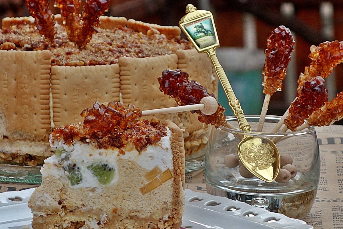 Crusta crocanta de nuci;Se caramelizeaza cescuta de zahar brun si cand devine lichid se adauga miezul de nuca si se da de pe foc.Se bate oul bine si se incorporeaza in caramelul de zahar cu nuca amestecand repede si continuuu pana se incorporeaza oul batut.(oul are rolul de a inmuia crantul de zahar si de a se taia la portionarea prajituriii cu usurinta)