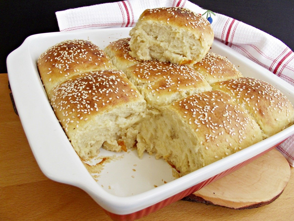 Le mai lasam la crescut maxim 15 minute, dupa care le ungem cu galbenus de ou amestecat cu lapte si presaram susan peste ele.