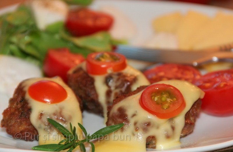 Peste chiftele am pus câte o felie de caşcaval şi le-am dat la cuptorul cu microunde pentru 2 secunde şi le-am servit cu salată şi cîteva felii de caşcaval.