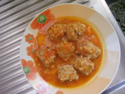 Se pune in cratita unu – doi catei de usturoi taiati in doua si uleiul de masline, dupa ce acesta s-a rumenit putin turnam sucul de rosii, (rosiile le spalam le indepartam pielita si le dam pe razatoare), morcovul taiat rondele si lasam pe foc sa fiarba. Adaugam foaie de dafine si putin oregano. Intre timp amestecam carnea cu orezul, oul, sare si piper si facem perisoare potrivit de mari. Din 300gr. carne ies circa 10 bucati. Punem perisoarele in sosul care fierbe pe foc si le lasam sa fiarba la foc potrivit. Daca sosul de rosii scade mai adaugam apa asa incat in timpul fierberii, chiftelele sa fie acoperite aproape de tot cu sosul de rosii. La urma presuram patrunjel.