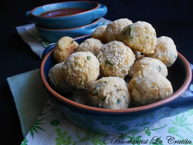 7. Cu mainile umezite luam cate putin din compoziie si formam bilute pe care mai apoi le vom da prin faina sau prin susan (depinde cum preferati) si le vom pune in tava tapetata cu hartie de copt.