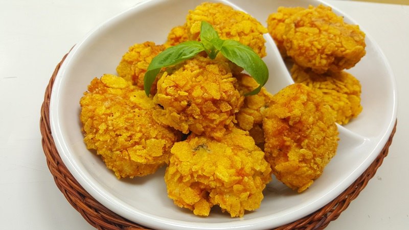 Cu mana umeda formam chiftelele,le tregem prin ou,faina si fulgii de porumb usor maruntiti.