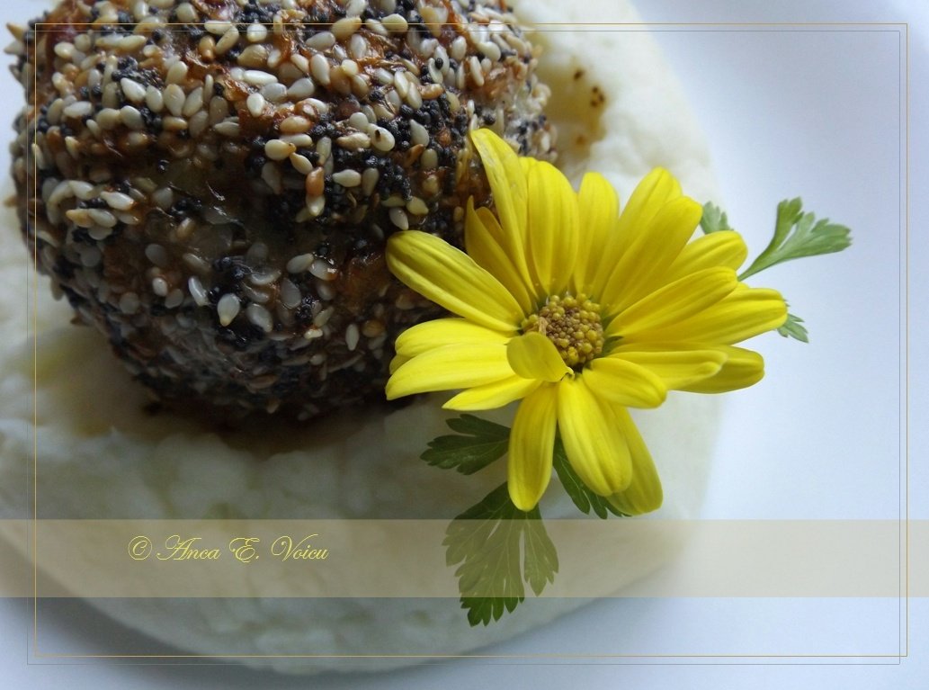 Dupa ce s-au fiert ouale, se racesc sub jet de apa rece, se decojesc, iar apoi se formeaza in mana o sfera de carne in jurul unui ou. Se tavalesc prin susan prajit. Se obtin astfel 4 chiftelute umplute. Se asaza in tava, pe foaie de copt si se dau la cuptor 30 de minute.